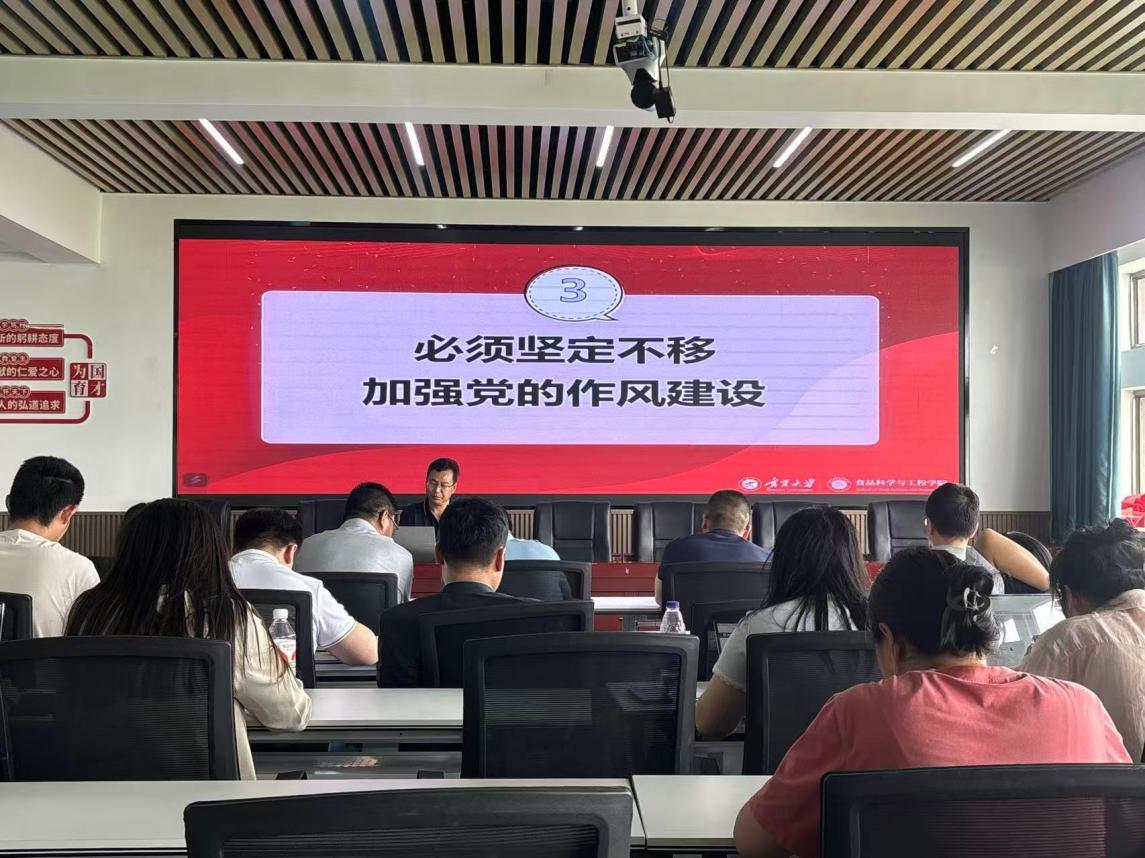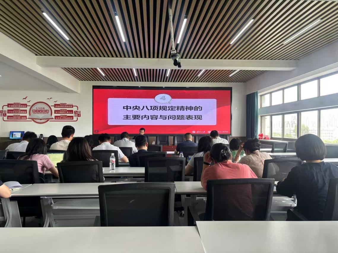 在讲授中央八项规定精神的主要内容时,他围绕“坚持求真务实、改进调查研究”“精简会议活动、反对形式主义”“倡导文风简朴、厉行节约反对浪费”等方面,分析了当前存在的问题和具体表现,强调要警惕形式主义会议、照本宣科调研、过度包装宣传等偏离中央八项规定精神本质的问题行为,提醒广大党员时刻自警自省,不踩红线、不越底线。结合高校教师职责,李书记提出,高校党员教师要以身作则,在教学、科研、管理等方面切实践行中央八项规定精神,营造风清气正的教书育人环境。