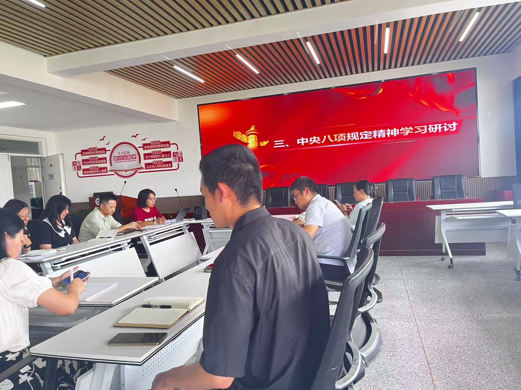在警示教育环节,全体党员集中观看了《留得清气满乾坤》和《“吃心”不改,纠风不停》两部专题警示教育片。通过典型案例的深刻剖析,与会人员深受触动。在随后的中央八项规定精神学习研讨中,各位教师党员结合工作实际积极发言,分享了在科研经费使用、师德师风建设、学术诚信等方面的学习心得和体会。大家纷纷表示,要时刻保持清醒头脑,严守纪律底线,以实际行动维护教师队伍的良好形象。