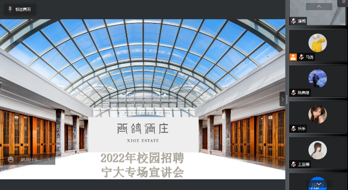 为了更好的拓宽毕业生就业渠道,2022年4月1日下午14:00,西鸽酒庄举办了线上招聘会议。通过PPT展示讲解的方式,HR向同学们介绍了公司的德州扑克游戏、现有产业结构、组织构架、福利待遇。西鸽酒庄成立于2017年,酒庄总建筑面积约2.5万平米,包含葡萄酒酿造区、橡木桶酒窖、灌装区、瓶装陈酿酒窖、专业品鉴区、游客接待中心、庄园酒店和有机特色餐厅,年设计产能1000万瓶,是宁夏综合设施相对完整、建筑标准超卓的酒庄。作为酒庄长期发展规划的一部分,西鸽种植团队仍在不断挑选优异条件的地块,预计22年将新开超过1万亩新地。此外,西鸽也持续投入品种及技术创新,不断挖掘宁夏风土的潜力与未来。此外我们也与法国波尔多学院,国内业内顶尖高校携手教研实践项目,为创新技术时间及人才培养提供平台。