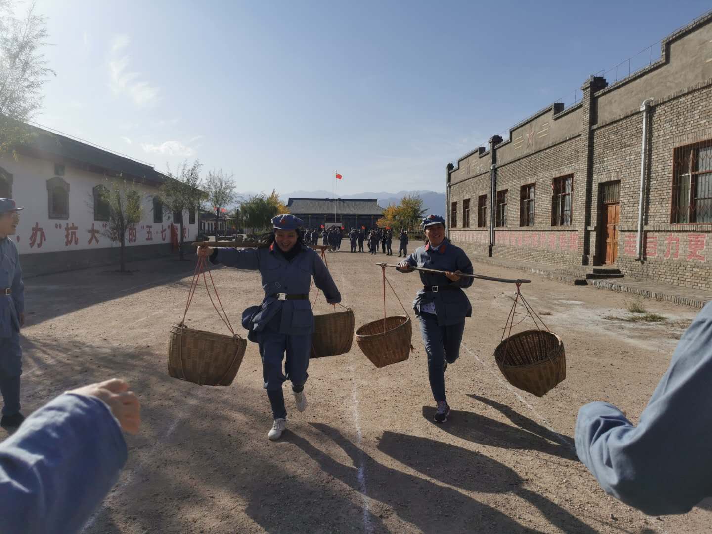 挑扁担比赛:一根扁担,两头弯弯,一头是收获,一头是血汗,我们美好的生活是老一辈革命人用血汗换来的,我们挑起扁担,感受那个年代艰苦的生活,我们挑起希望,大步向前。