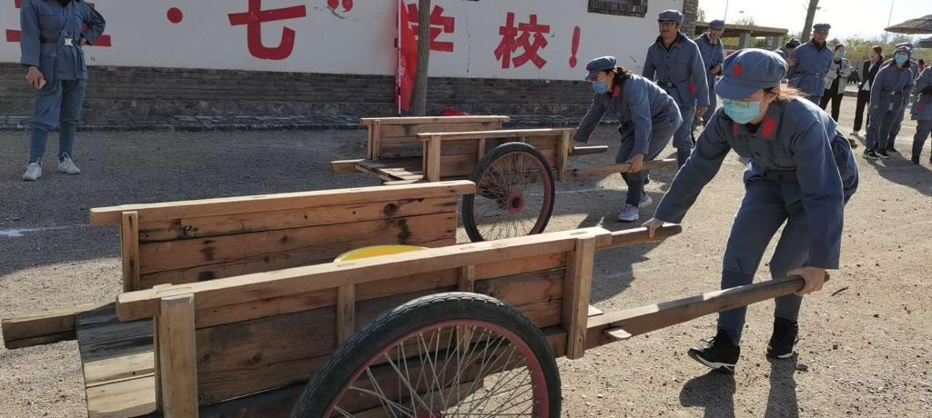 参观陈列馆,听讲解:听讲解员讲述干校的沧海桑田,了解老一辈们在艰苦环境中劳动、生活、学习情况,让大家一起重温历史,切实增强吃苦耐劳、艰苦奋斗精神和历史使命感、社会责任感。之后进行了拉架子车比赛:老一辈人拉架子车春耕秋收,推粮送面,进而为祖国的稳定发展打下了良好基础,而今,让我们拉起架子车,稳抓稳打炼意志,一心一意跟党走。