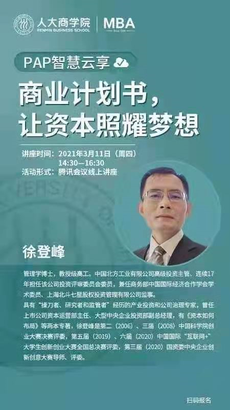 为提高学生创新创业能力,提升学生创业计划书写作水平,3月11日下午2点半到4点半,将由历届互联网+大赛国赛评审徐登峰博士带来商业计划书撰写的线上专题讲座,本次讲座采用腾讯会议的方式进行,会议号:945155921。讲座将教会学生如何去撰写和打磨商业计划书,对参赛学生非常实用。欢迎各位老师、学生踊跃参加。