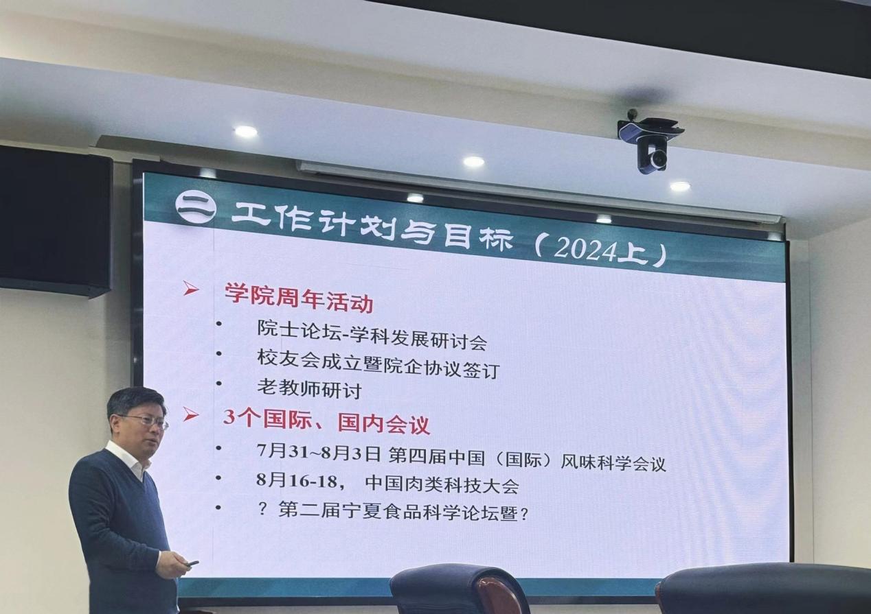 刘源就本学期学院行政工作、学科建设与科研重点任务作了安排部署,对学院制度建设、组织架构、治理体系、人才培养、整体搬迁与基础工作等方面的总体规划谈了工作思路,并表示要结合学院周年庆典活动的开展,举办宁夏食品学会年会、食品学科发展研讨会、西部地区食品学科青年学者论坛、第一届中国(国际)风味科学论坛等,成立食品学院校友会,积极联系并与政府部门、食品企业、科研机构签署合作协议,开展多方位、深层次、互惠多赢的合作交流,进一步强化学院高质量内涵式发展,共创美好未来。
