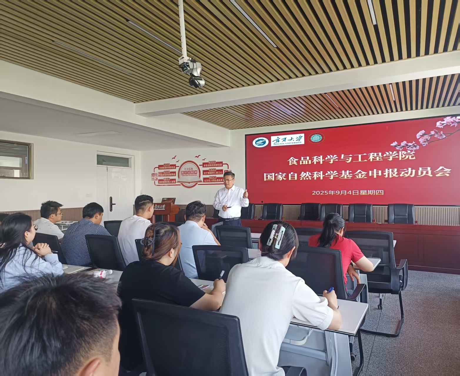 2025年9月4日,2025年国家自然科学基金总结暨2026年申报动员会在食品学院会议室举行,食品学院骨干教师和青年教师参会。本次会议旨在总结2025年国家自然科学基金申报和立项情况,并对2026年的申报工作明确方向、凝聚力量做了动员。