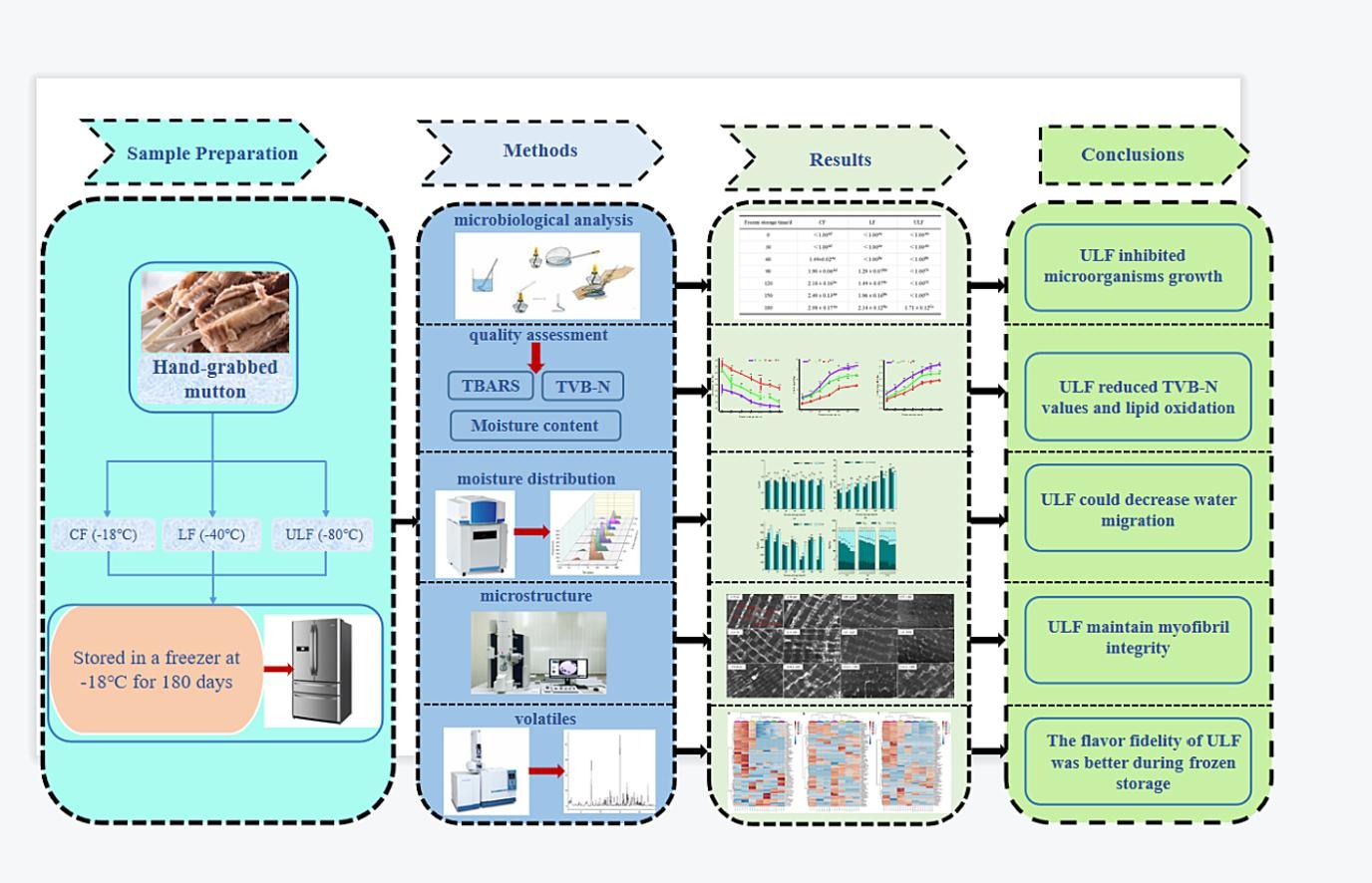 本研究揭示了在长期冷冻贮藏过程中,不同的冷冻温度对手抓羊肉的品质、水分分布、微观结构和风味的影响。