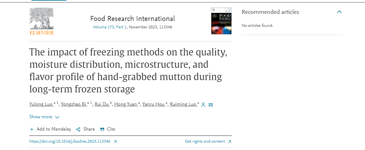 罗瑞明教授团队在国际食品Top期刊《Food Research International》(Q1,IF: 8.1)发表题为“The impact of freezing methods on the quality, moisture distribution, microstructure, and flavor profile of hand-grabbed mutton during long-term frozen storage”的研究性论文。